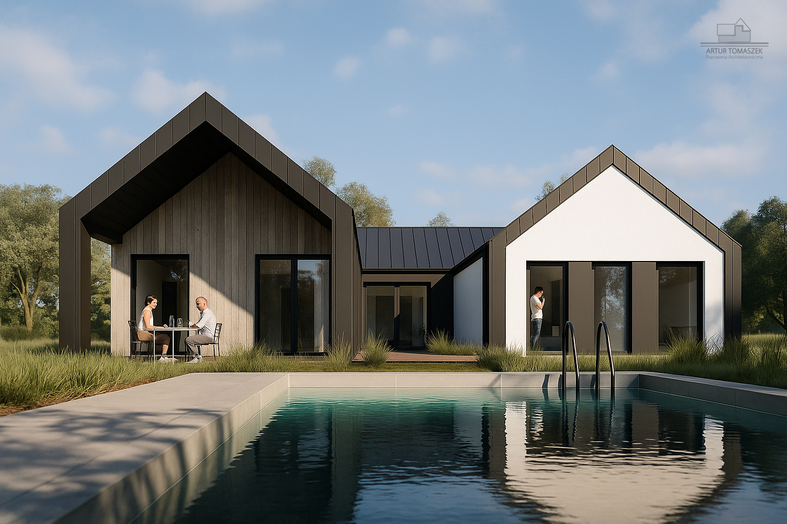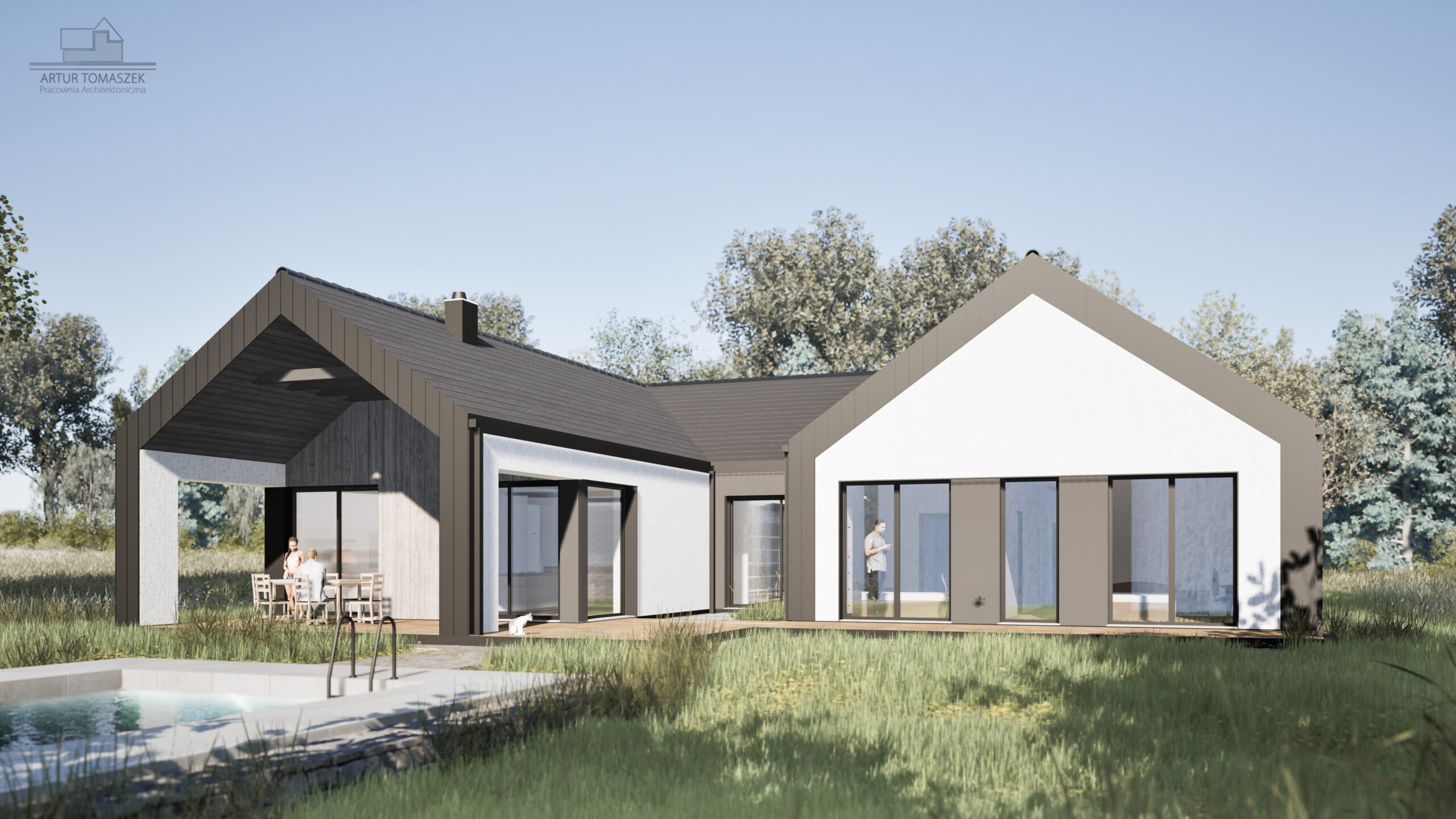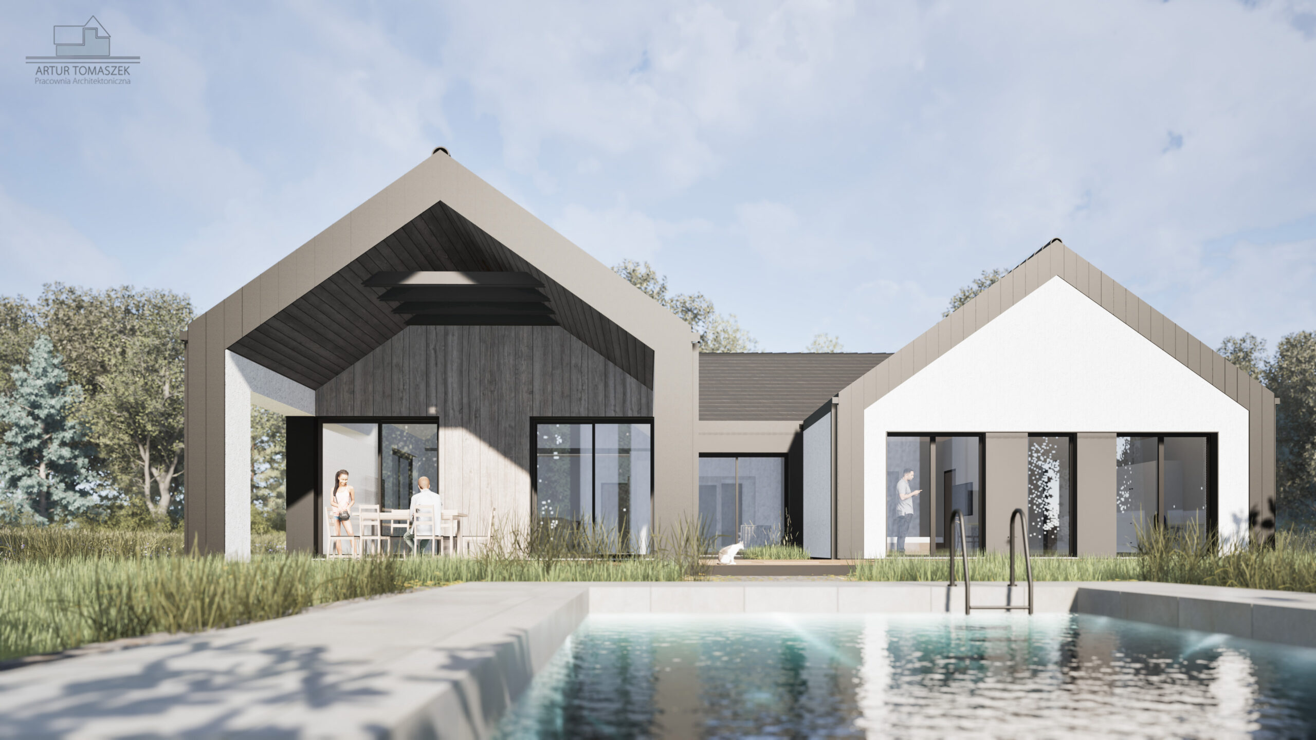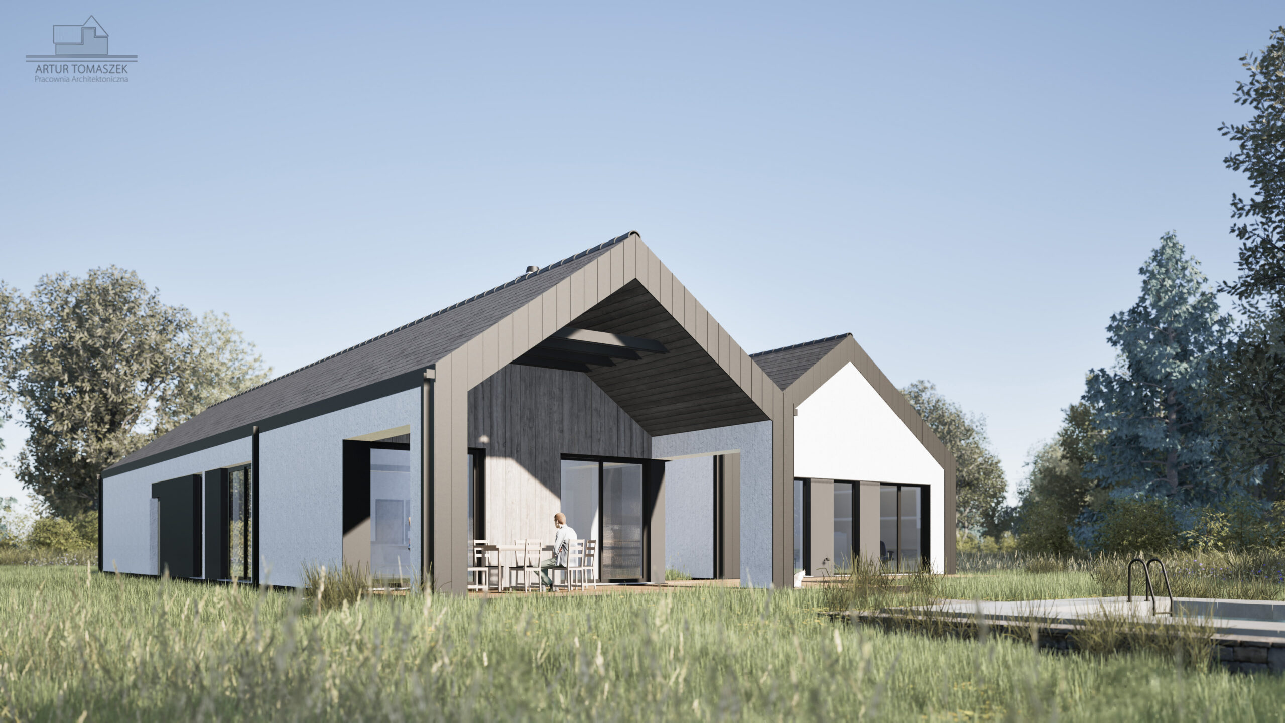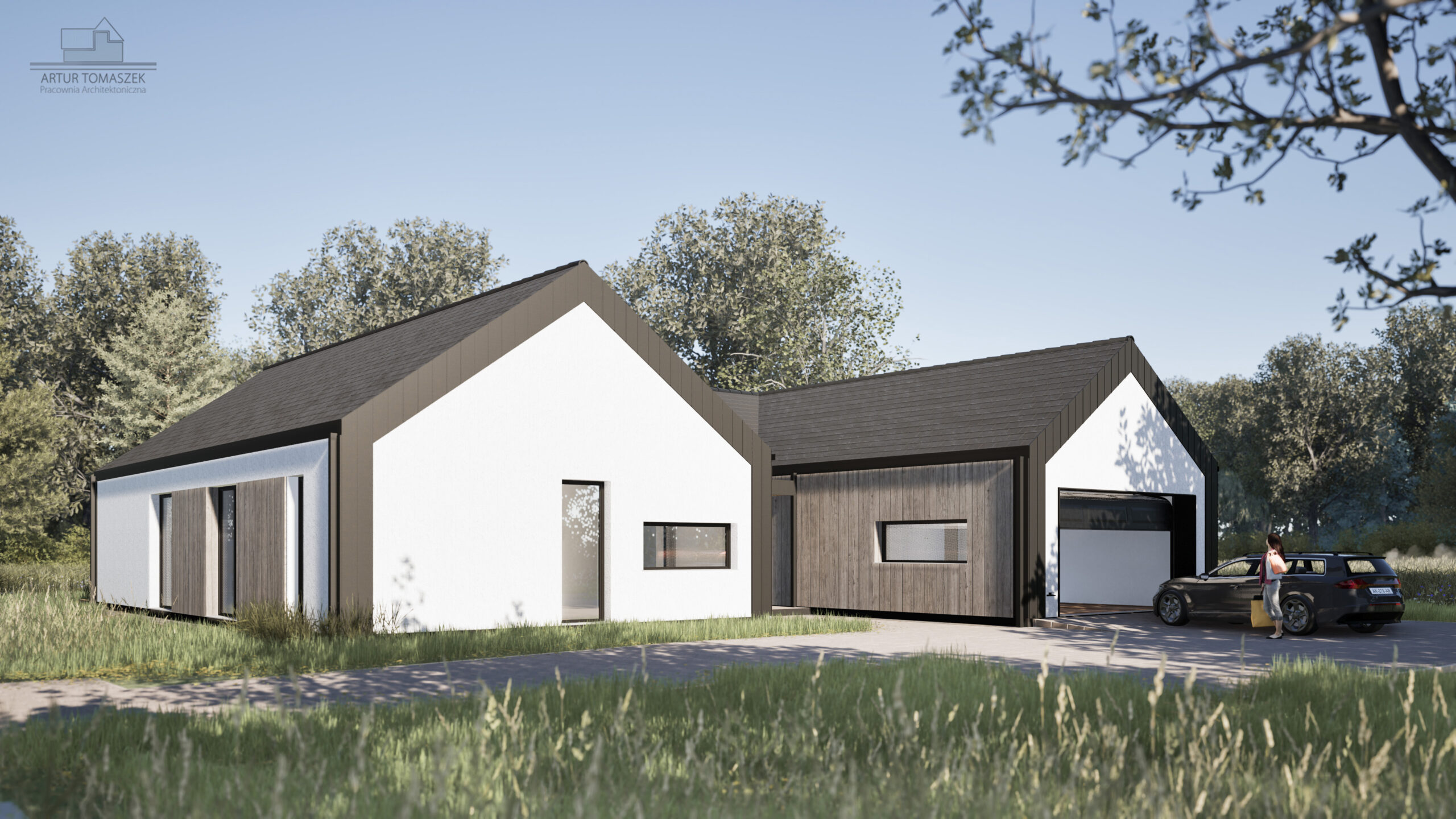 Bryła zewnętrzna domu oparta na planie litery „H” zwieńczona jest dwuspadowym, bezokapowym, ciemnym dachem. Białe elewacje uzupełniają drewniane wstawki oraz wykończenia narożne z blachy płaskiej.