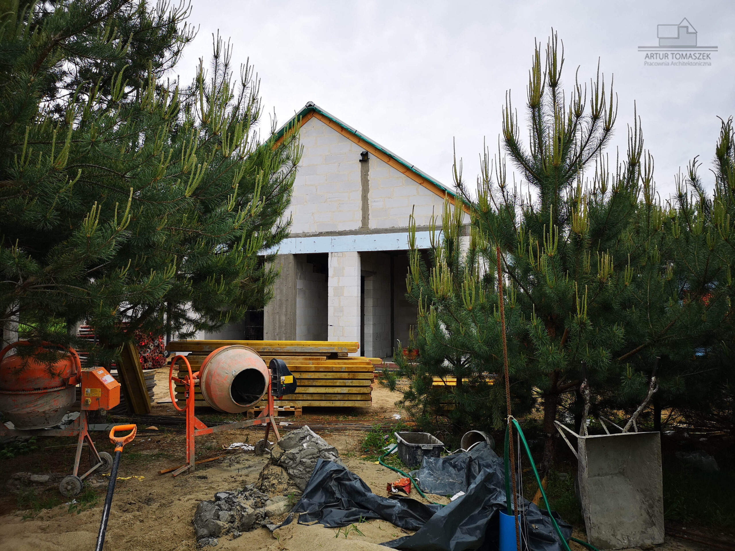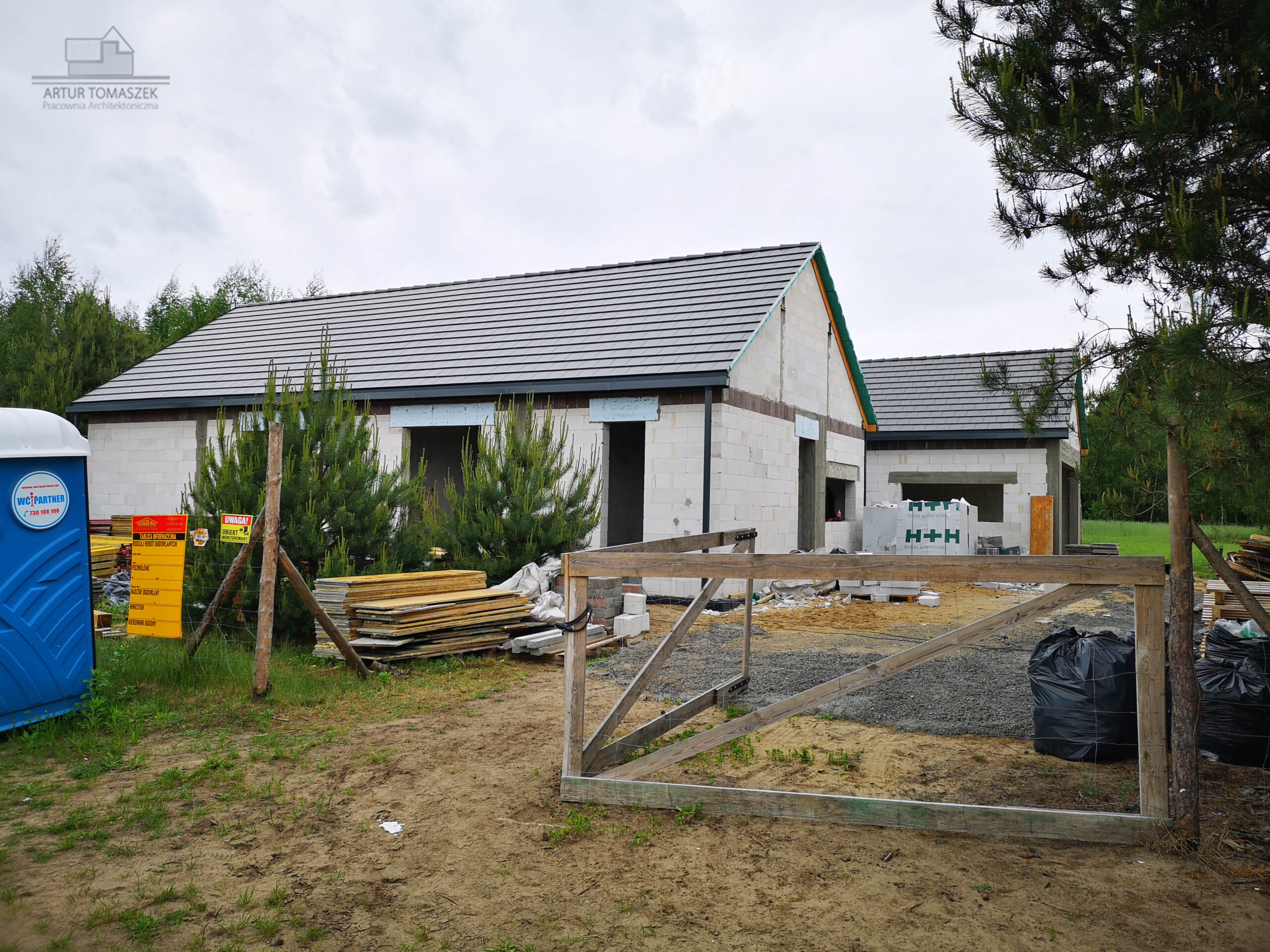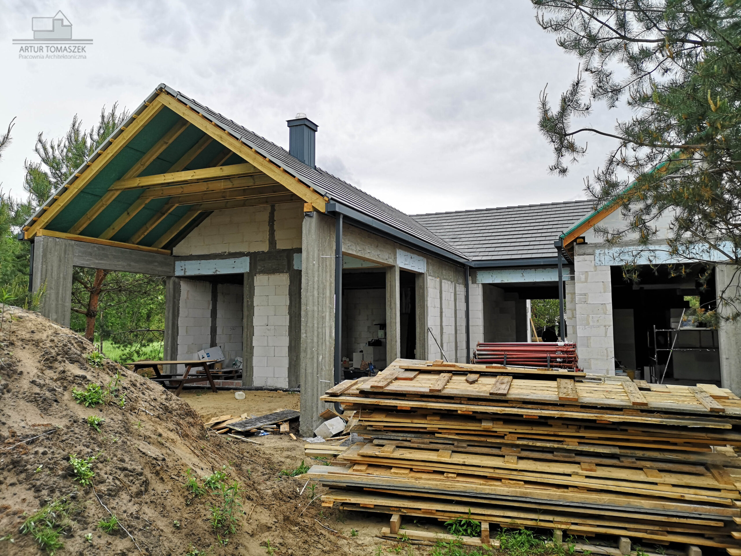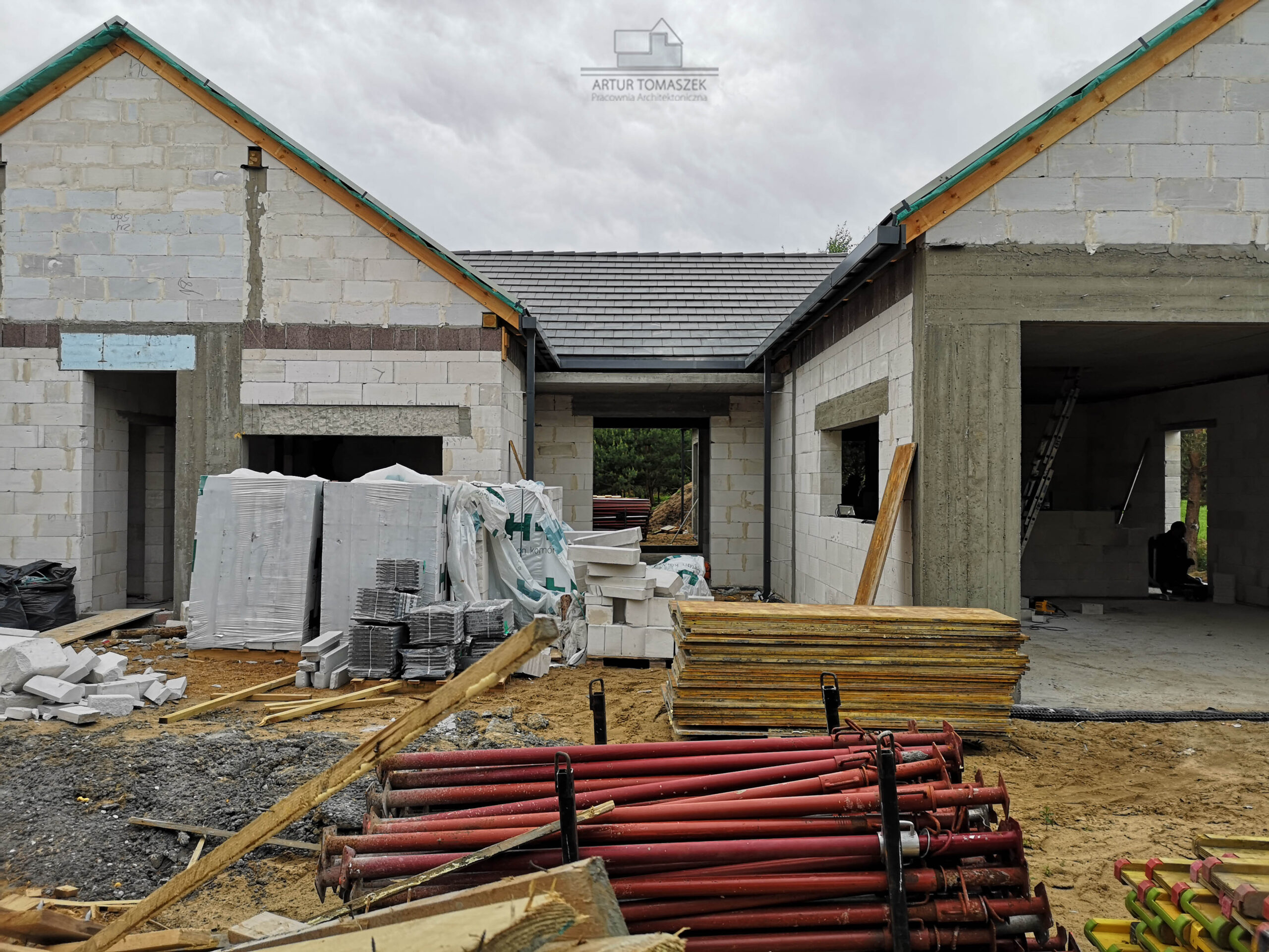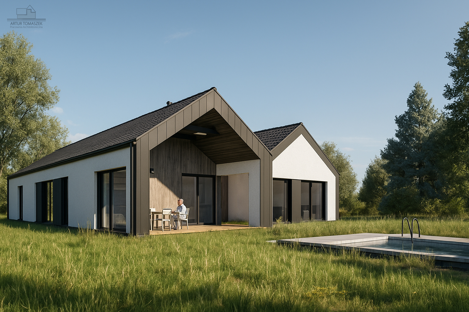 Bryła zewnętrzna domu oparta na planie litery „H” zwieńczona jest dwuspadowym, bezokapowym, ciemnym dachem. Białe elewacje uzupełniają drewniane wstawki oraz wykończenia narożne z blachy płaskiej.