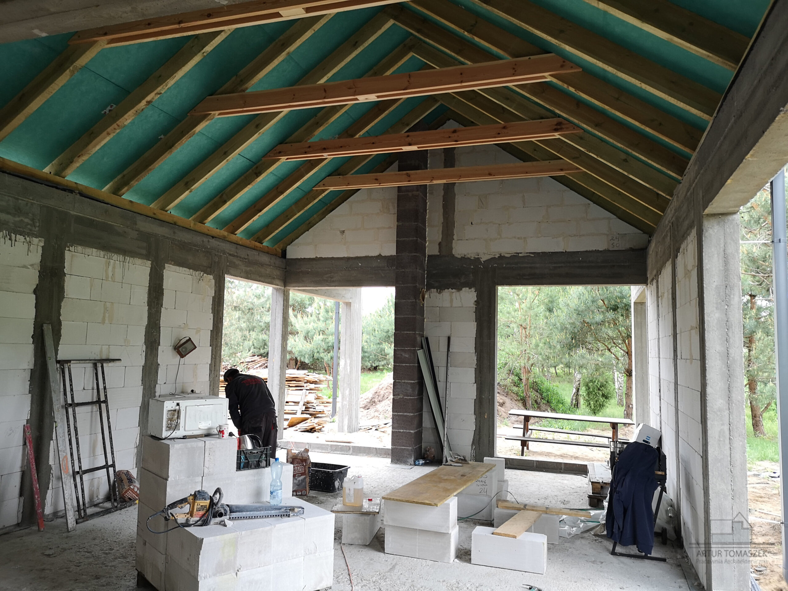 Każda ze stodół pełni różne funkcje. W jednej mieści się strefa dzienna (przestronny salon) oraz część garażowo – techniczna. Salon otwarty jest na skosy dachu tworząc sufit katedralny. Motyw powielony jest na tarasie stanowiącym przedłużenie bryły domu. W drugiej stodole mieści się strefa nocna (trzy pokoje dzieci, pralnia, gabinet i master bedroom). Stodoły połączone są łącznikiem – przeszkloną przestrzenią stanowiącą strefę wejściową i komunikacyjną domu. To dodatkowy pokój zapraszający domowników i gości do poszczególnych części domu.