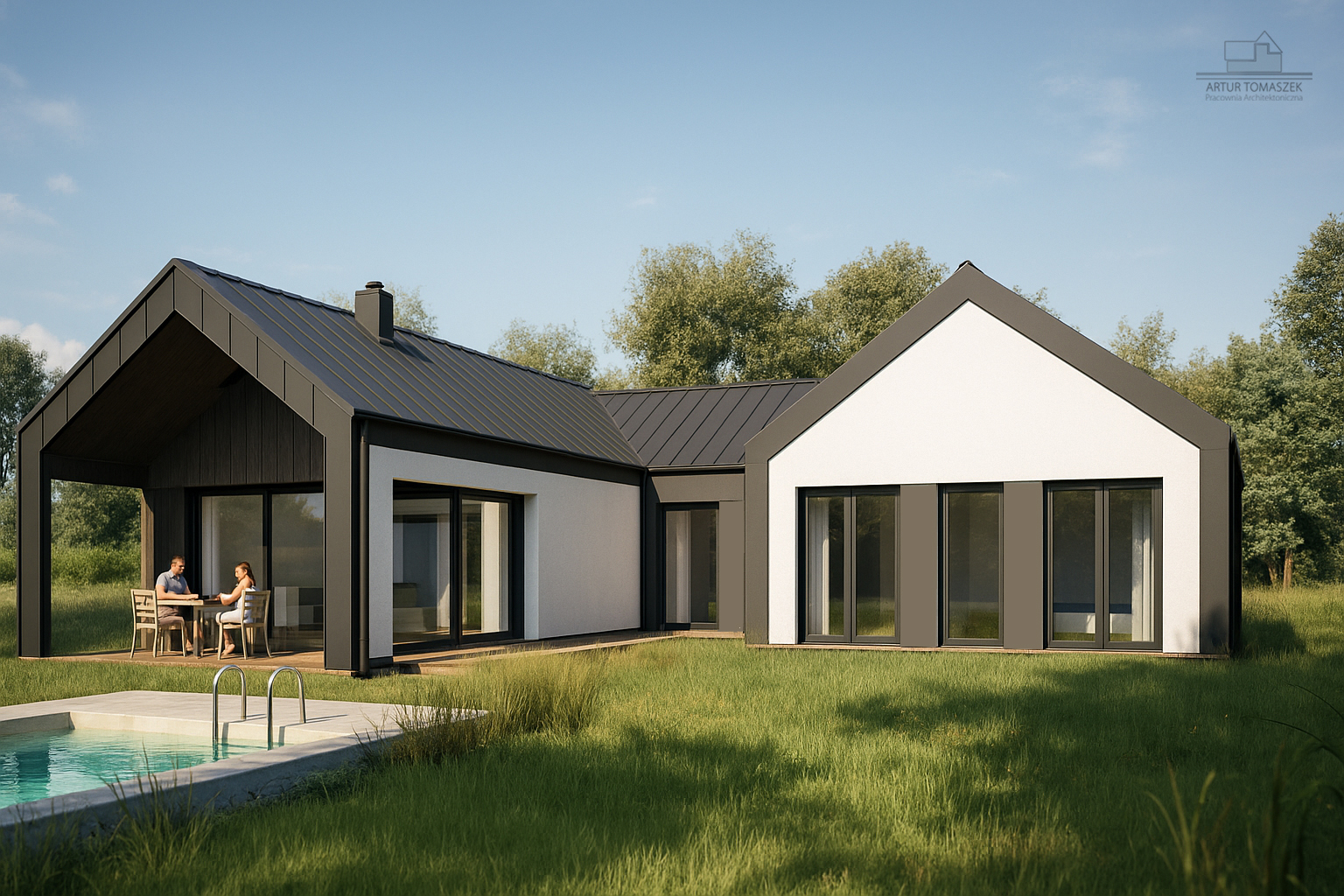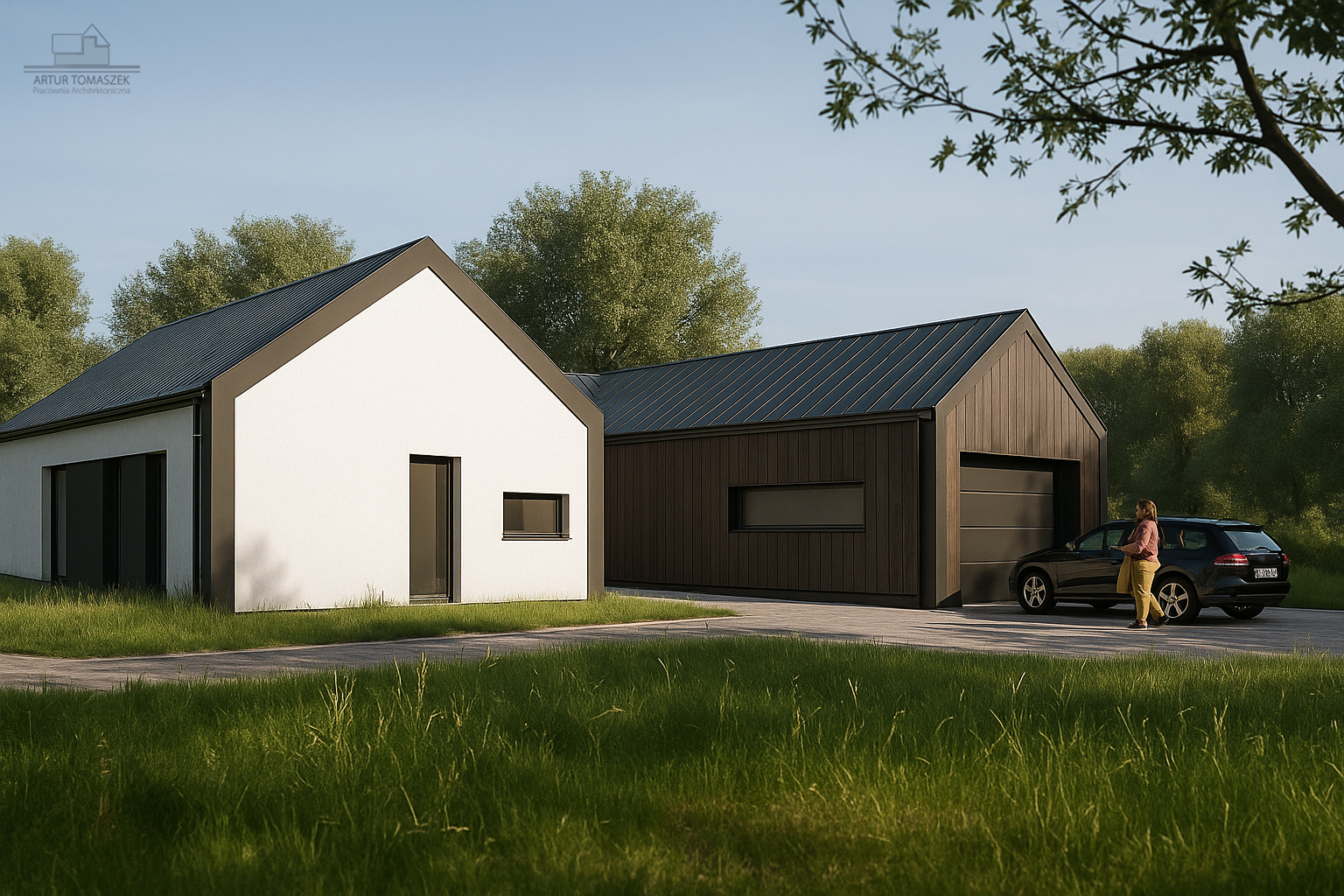 Dom składający się z dwóch stodół i łącznika to dość nietypowa koncepcja architektoniczna, łącząca tradycyjne elementy wiejskiego budownictwa z nowoczesnym podejściem do przestrzeni mieszkalnej. Projekt czerpie inspirację z rustykalnych form, ale dodaje elementy współczesnego designu, tworząc harmonijną przestrzeń łączącą naturę z komfortem współczesnego życia.
