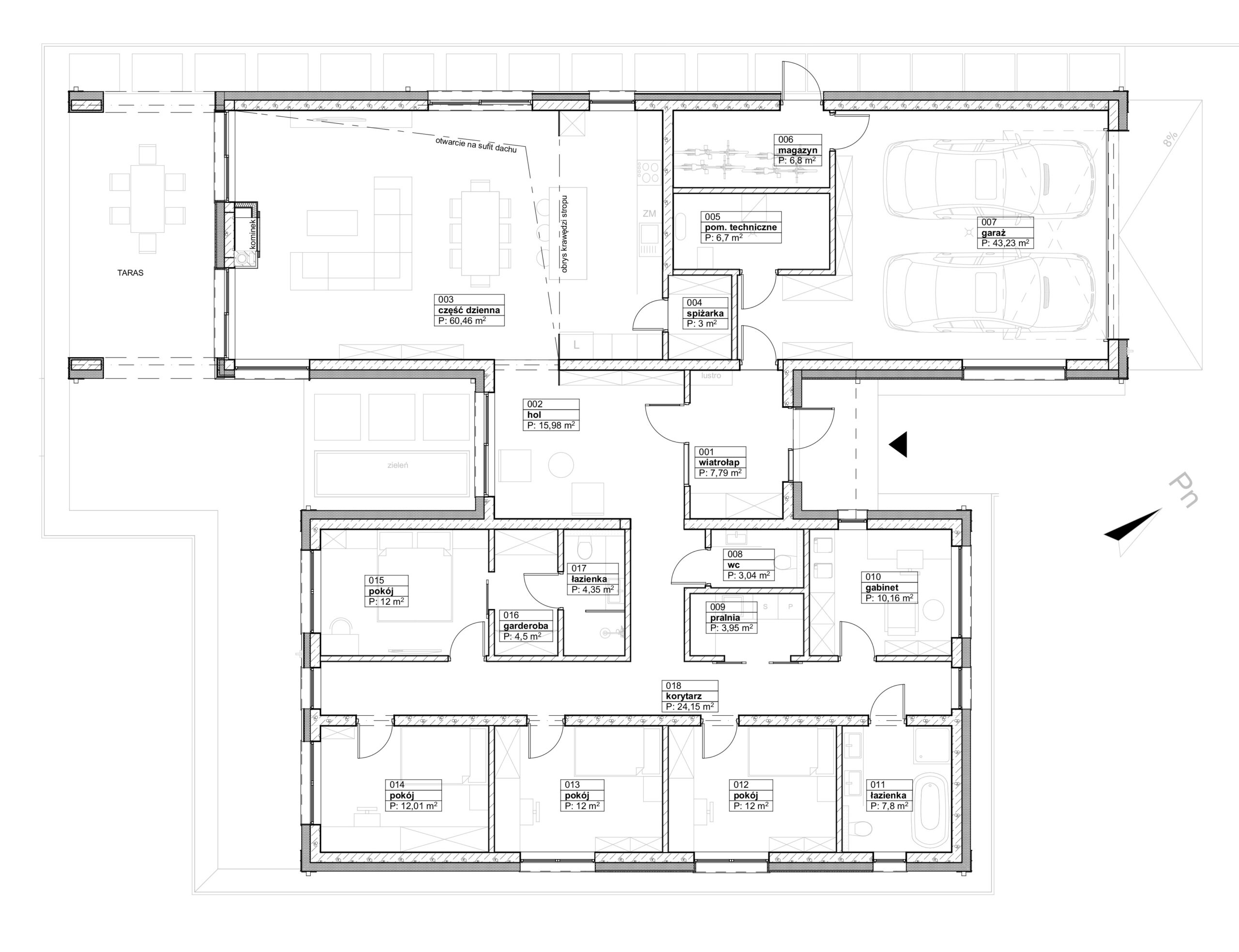 Projekt charakteryzuje się czytelnymi wnętrzami o spójnych proporcjach poszczególnych pomieszczeń. Długie korytarze zakończone są doświetlającymi oknami z pięknymi widokami na działkę. Z każdego miejsca w domu zapewniony jest interesujący kadr, co sprawia, że projekt stanowi kompletny i przemyślany twór – prawdziwy projekt indywidualny.