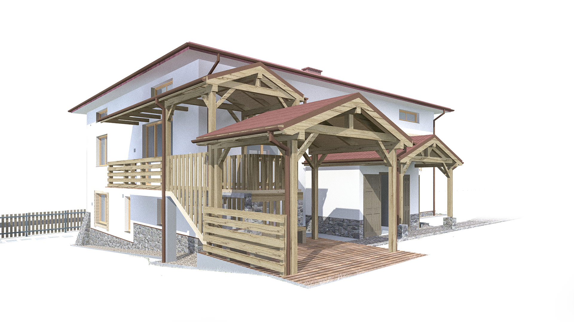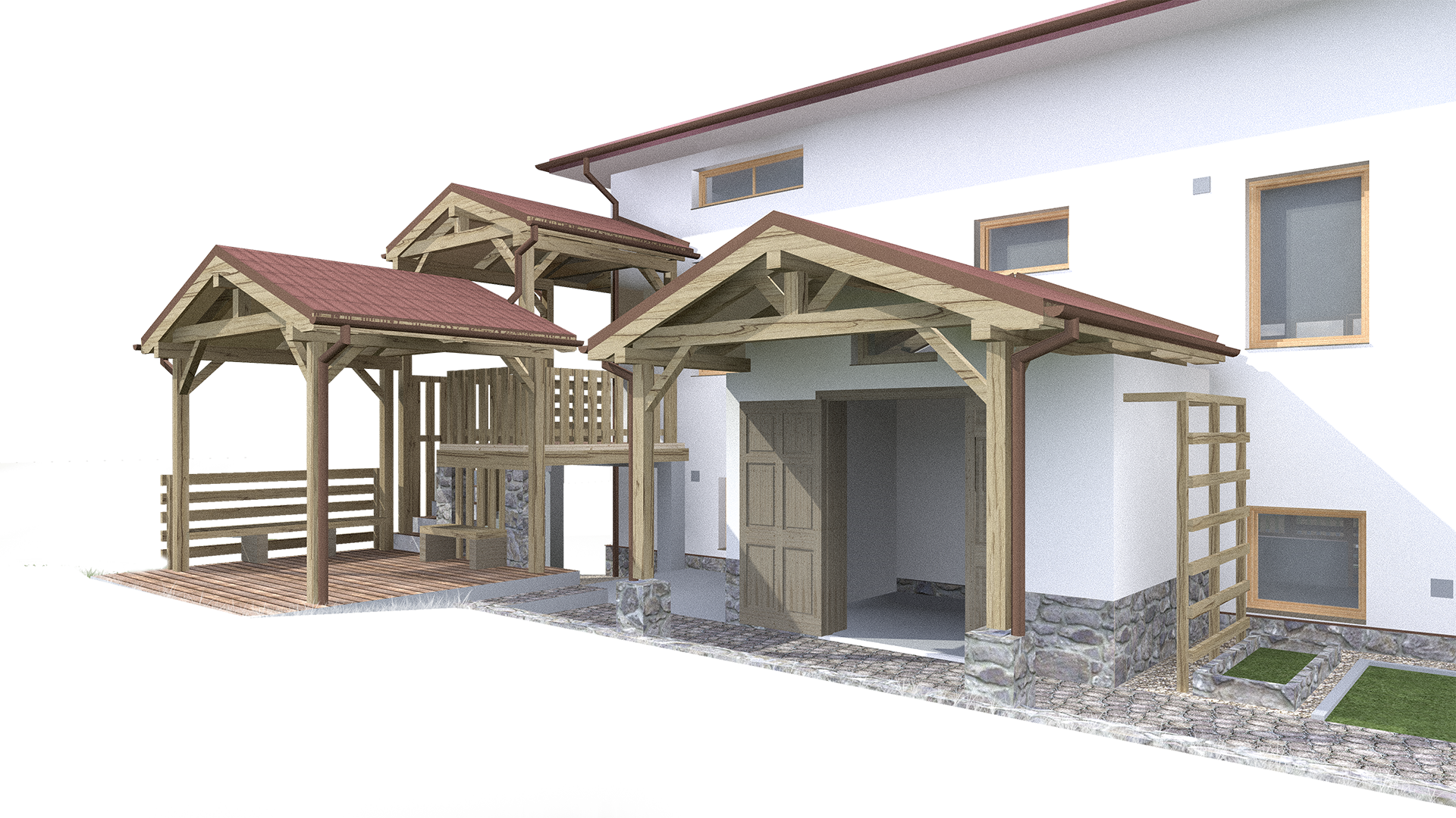 Głównym pomysłem na nową architekturę były drewniane dobudowy. Stworzono kilka zadaszeń przenikających się ze sobą i dzielących funkcjonalnie każdą z nich. Ganek będący wiatrołapem to strefa wejściowa. Obok niego zaprojektowano niewidoczny z drogi taras. Połączono go schodami zewnętrznymi z dawnym salonowym balkonem.