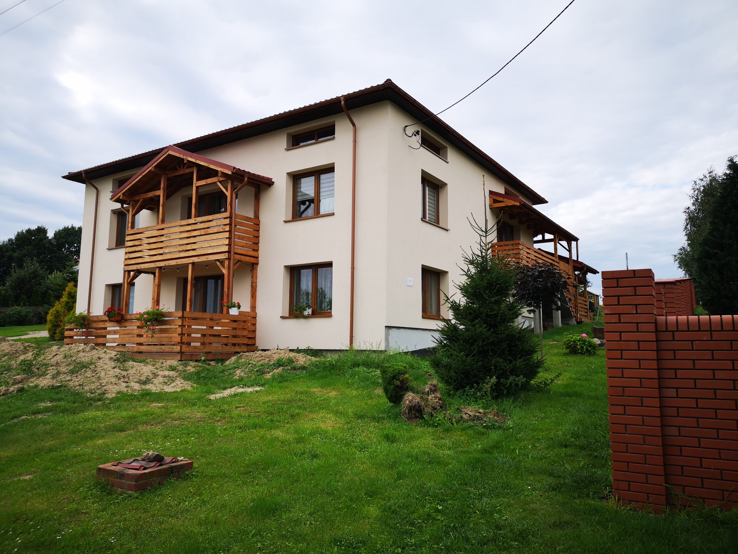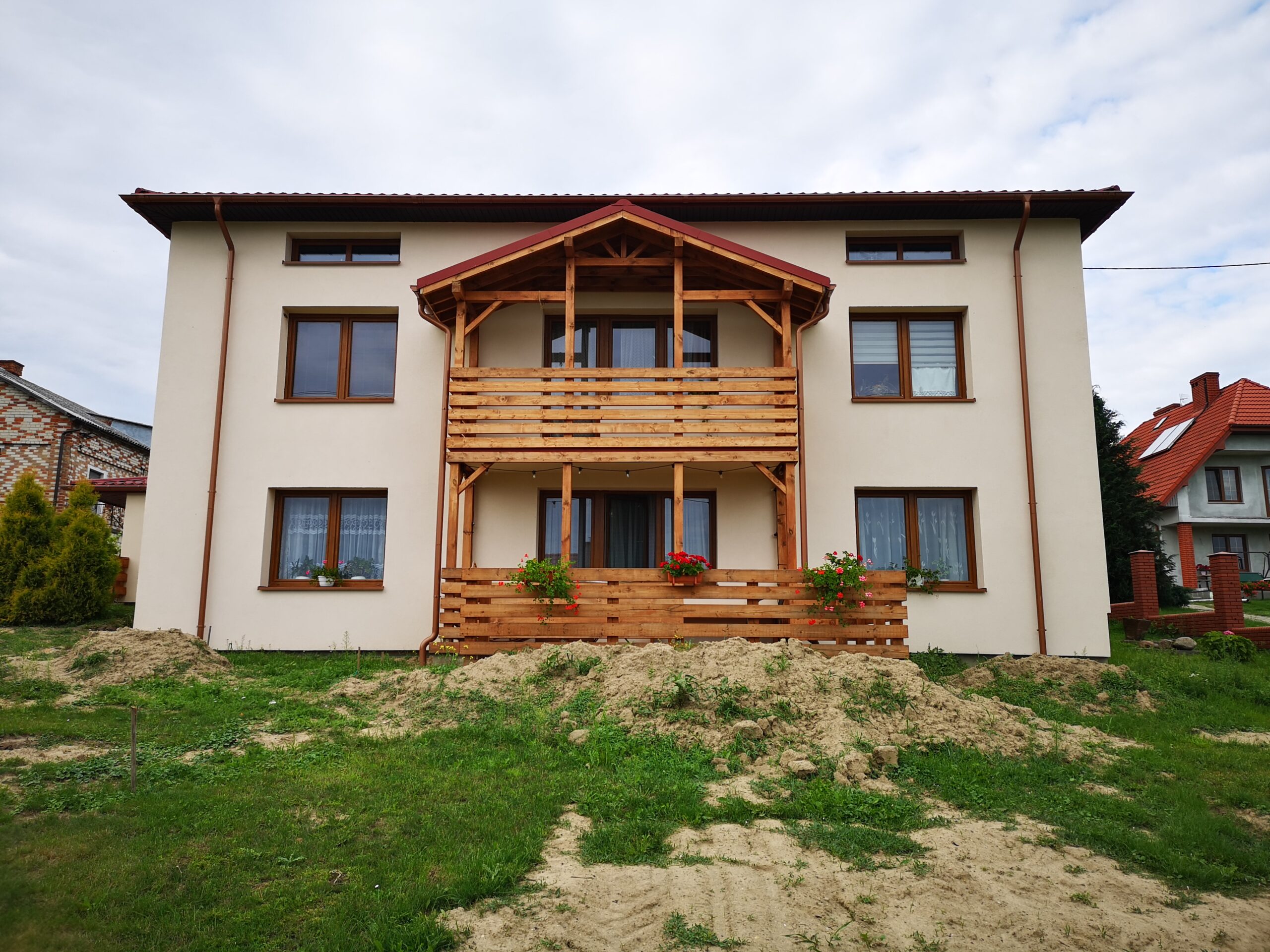 Od południa frontowy ryzalit przykrywa dawne balkony. Dodaje główny akcent wizualny domu. Urozmaica prostą i pragmatyczną architekturę. Nawiązuje do tradycyjnych drewnianych wiat. Cokół planowany w kamieniu wapiennym to ostatni etap wykończenia elewacji. Sprawi, że budynek płynnie posadowi się w otaczającym go terenie.